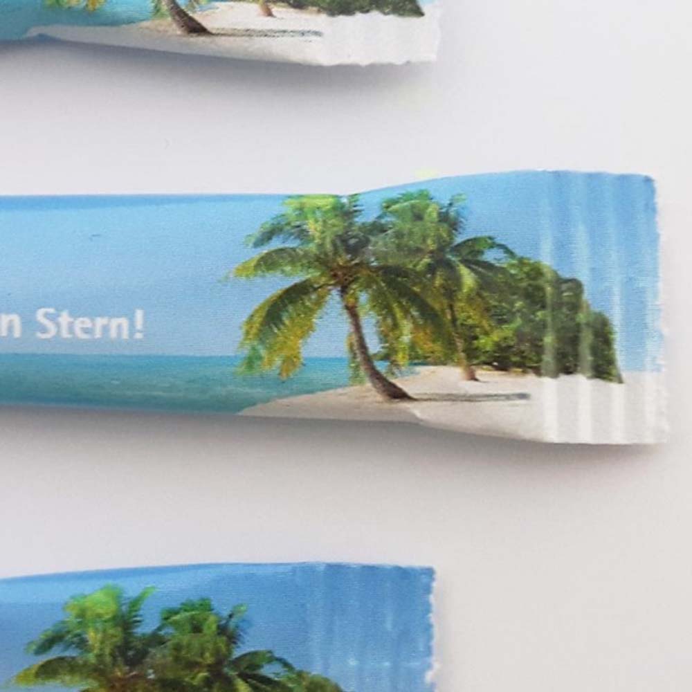 Der Siegelrand ist nur bedingt bedruckbar. Bitte beachten Sie, dass Schriften oder wichtige Bildelemente nicht zu nah am Rand platziert werden. Auf dem Zuckerstick-Siegelrand werden standardmäßig Schneidemarken, ggf. Passermarken, und Herstellungscode mitgedruckt, die produktionstechnisch notwendig sind. Produktionstechnisch bedingt kann es dazu kommen, dass einige Zuckersticks leicht schräg geschnitten werden oder geringe Mengen Zucker lose im Karton vorzufinden sind.